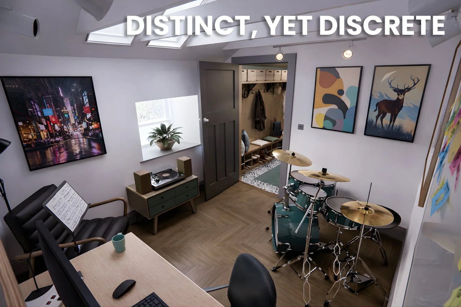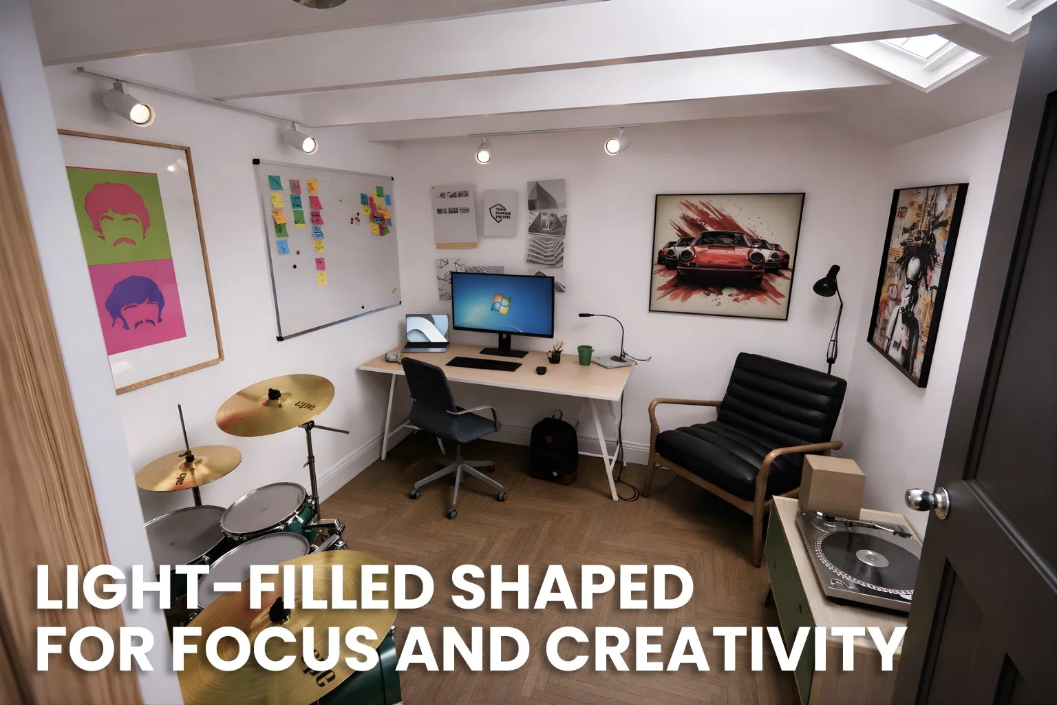 Within the studio, the design takes a more expressive approach. The ceiling is opened up to expose the existing structure, creating a greater sense of volume and reinforcing the character of the space. Rooflights are introduced above to bring natural light deep into the plan, transforming what would otherwise be a darker, secondary area into a bright and purposeful room. This combination of volume and light helps define the studio as a distinct but complementary part of the overall home.