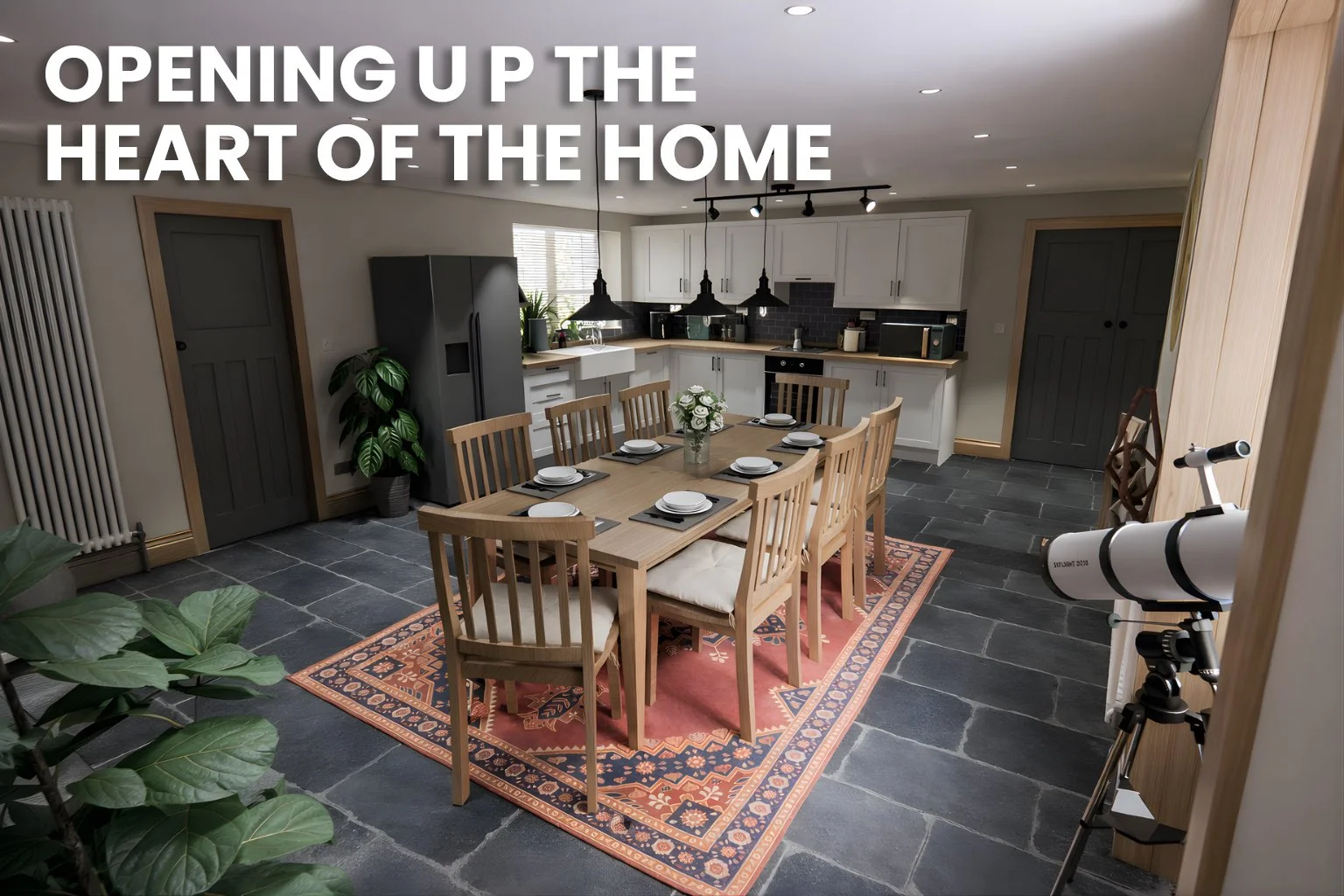 At ground floor level, the most significant intervention is within the kitchen and dining area. Previously formed of a series of small, restrictive rooms, this part of the house lacked both functionality and natural flow. The design removes these constraints by opening up the plan to form a more generous and connected kitchen and dining space. This allows the area to function as the primary living space within the home, improving circulation, usability, and the overall quality of the internal environment.